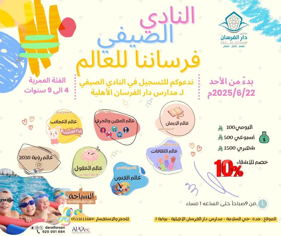 في نادي "فرساننا للعالم" ، نخوض مغامرات التعلم والمرح، ونكتشف مهارات تُحلّق بأحلام أطفالنا! جاهزون لصيف استثنائي؟ للتسجيل والحجز & 128222 0531611684 جدة - حي السلامة - بوابة 7